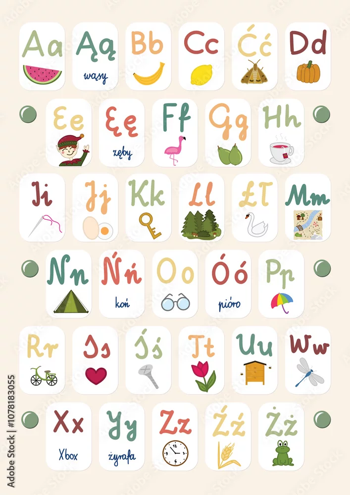Obraz Polski alfabet dla dzieci, plakat ręcznie malowany, nauka polskiego, edukacja domowa, beżowe kolory, nauka liter, nauka pisania,