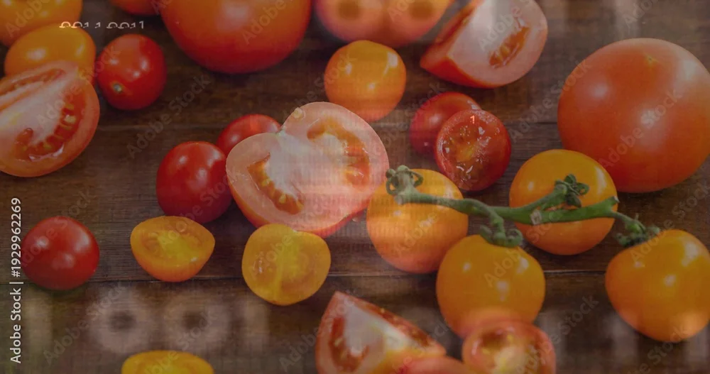 Obraz Showing red and yellow tomatoes halved and whole, resting on rustic wood table, vine, timestamp