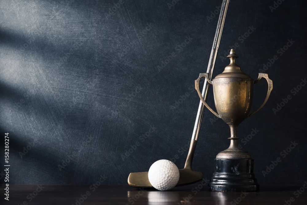 Obraz kij golfowy (miotacz) i piłka ze starym trofeum