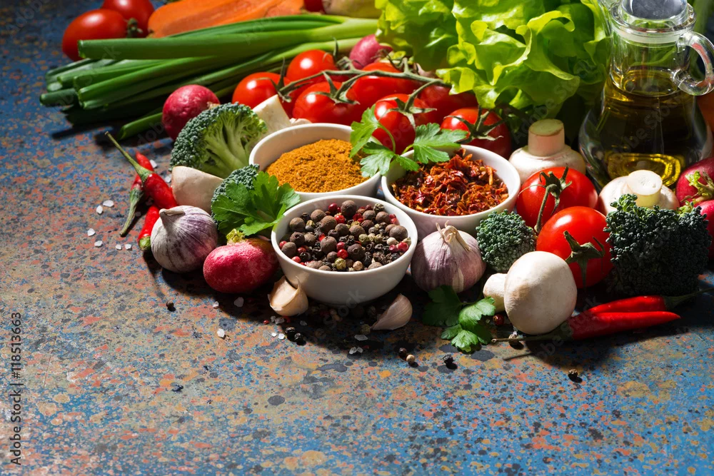 Obraz asortyment przypraw i świeżych organicznych warzyw