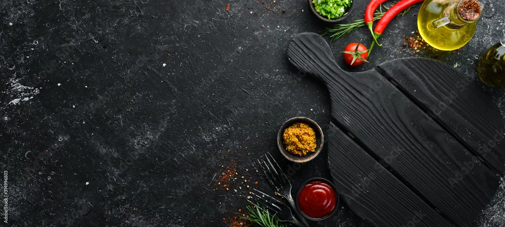 Obraz baner kulinarny. Warzywa i przyprawy na stole w kuchni.
