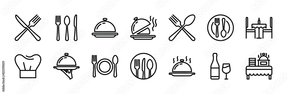 Obraz Catering thin line icon set. Containing fork, spoon, knife, plate, cloche, tray, chef hat, beverage, food, dining table, and waiter. Cutlery or tableware in restaurant. Vector illustration