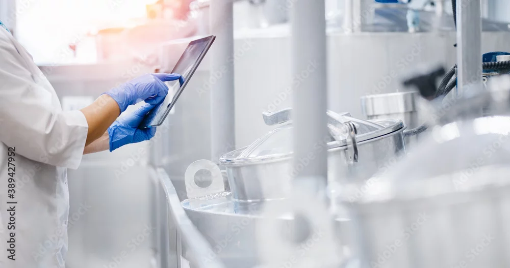 Obraz Concept food industry banner. Factory worker inspecting production line tanker in of dairy factory with computer tablet