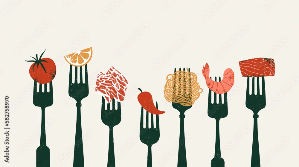 Obraz Forks with various food. Tomatoes with lemon and shrimp with pepper and salmon. Horizontal food design template. Vector illustration
