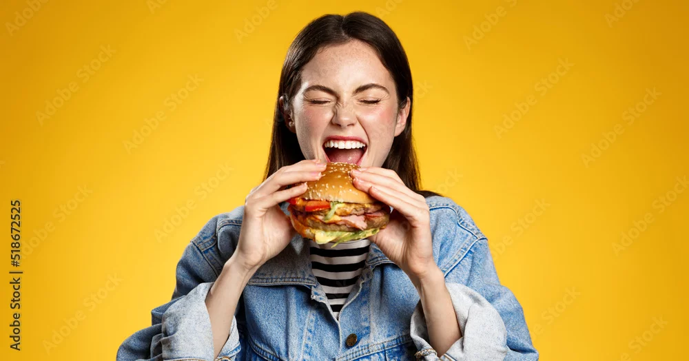 Obraz Girl bites cheeseburger with pleasure. Woman eating hambuger, order burger for takeaway food delivery at fastfood restaurant