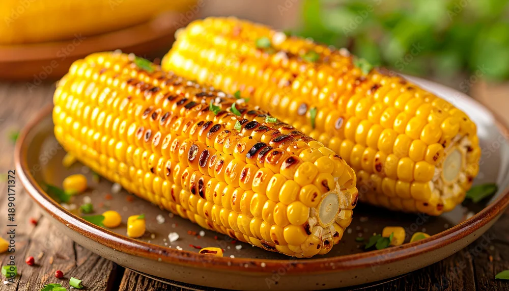 Obraz Grilled corn cob on plate, placed on wooden table, delicious homemade snack, tasty food