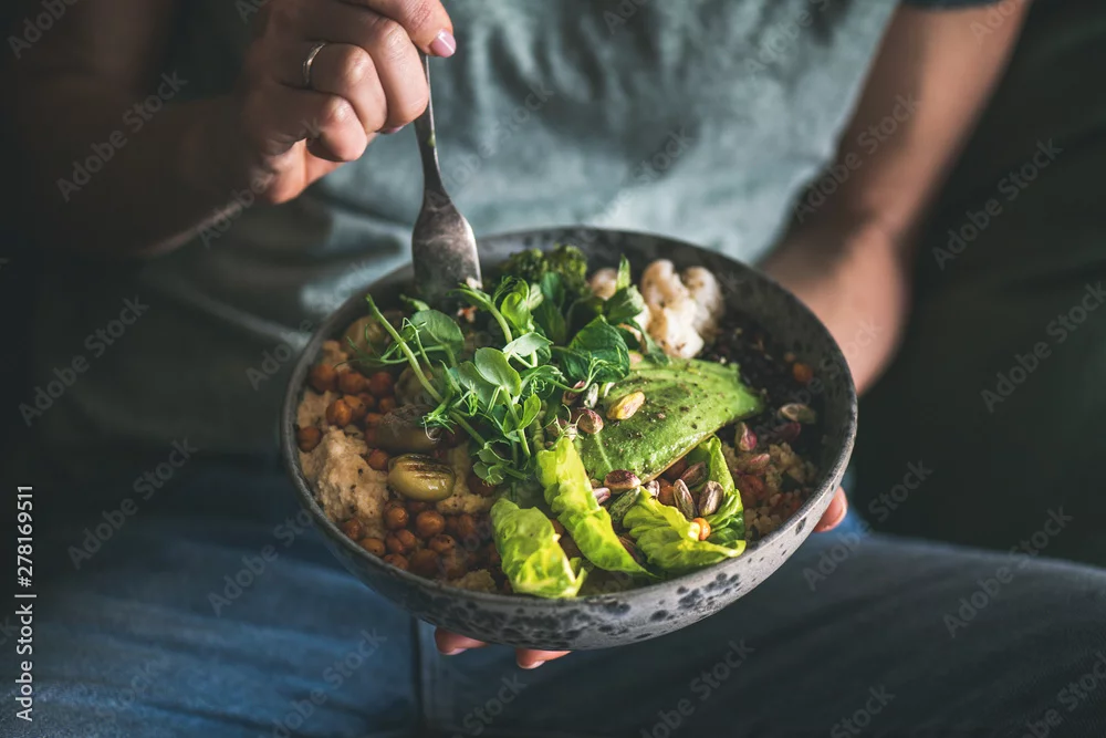 Healthy dinner or lunch. Woman in t-shirt and jeans eating vegan superbowl or Buddha bowl with hummus, vegetable, salad, beans, couscous and avocado