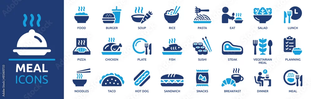 Obraz Meal icon set. Containing food, lunch, eat, dinner, pasta, rice, pizza, salad, soup, breakfast and more. Vector solid icons collection.