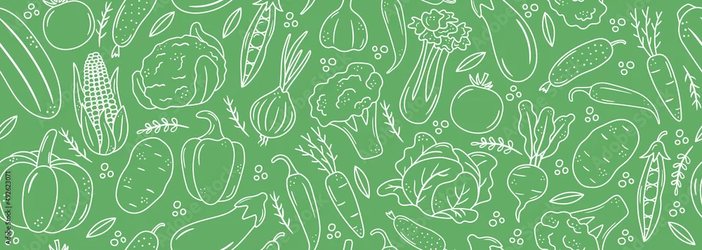 Seamless banner with outline vegetable icons. Background with hand drawn drawings of carrot, cabbage, broccoli, corn, pumpkin. Sketch food pattern. Doodle silhouettes of harvest elements