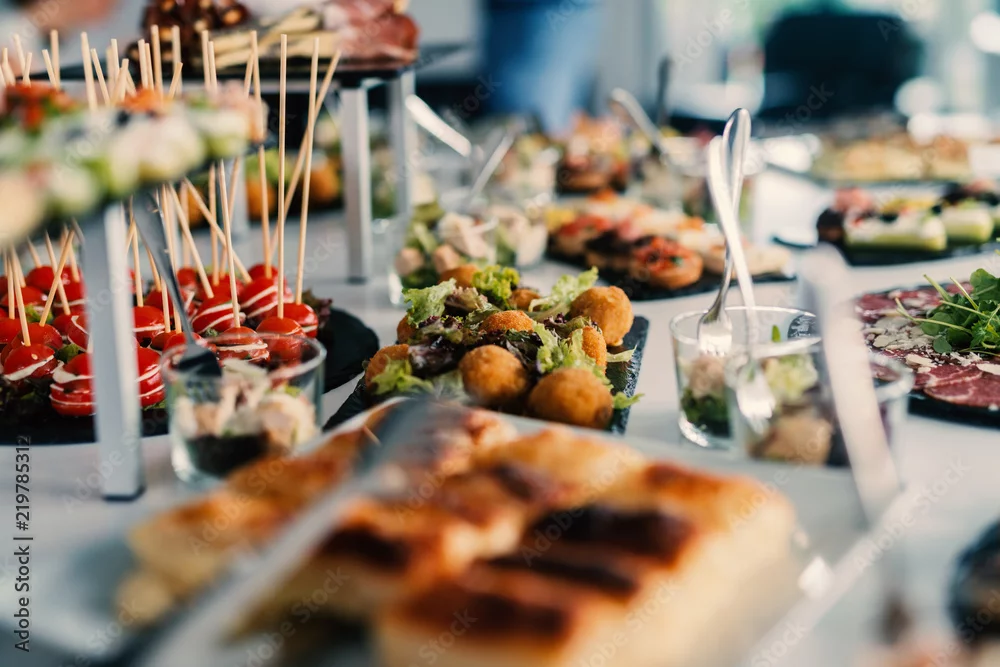 Obraz Stolik pełen smacznego jedzenia pięknie zdobiony.