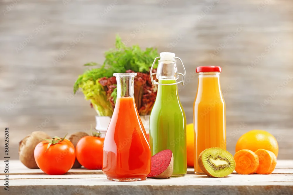 Obraz Szklane butelki świeżego zdrowego soku z zestawem owoców i