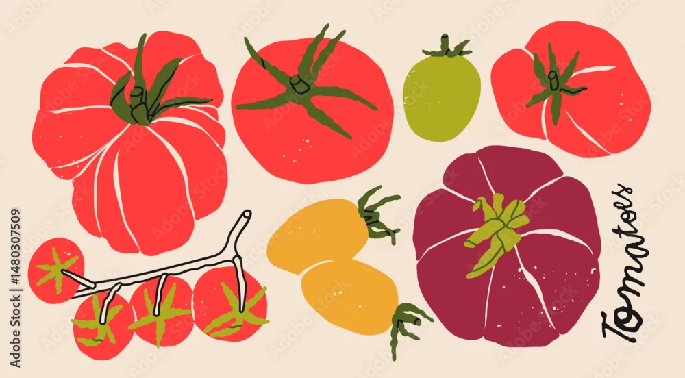 Obraz Various fresh, juicy tomatoes set. Whole red, green, black tomatoes, cherry tomatoes on a branch. Hand drawn modern Vector illustration. Isolated design elements. Healthy, natural food concept