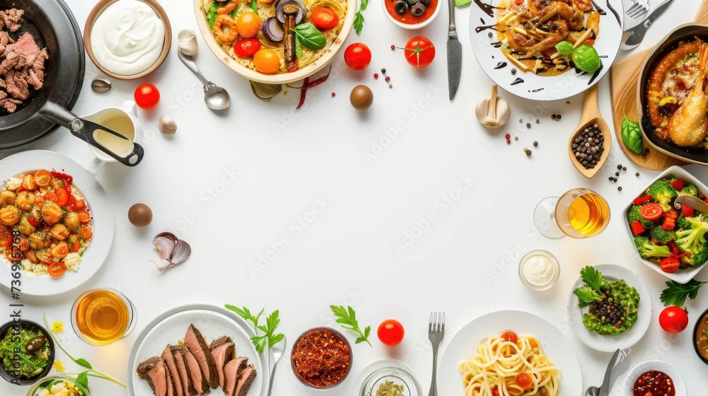 various restaurant foods are located on the table forming an empty space for the design of decorative frames, cards, backgrounds, banners and posters