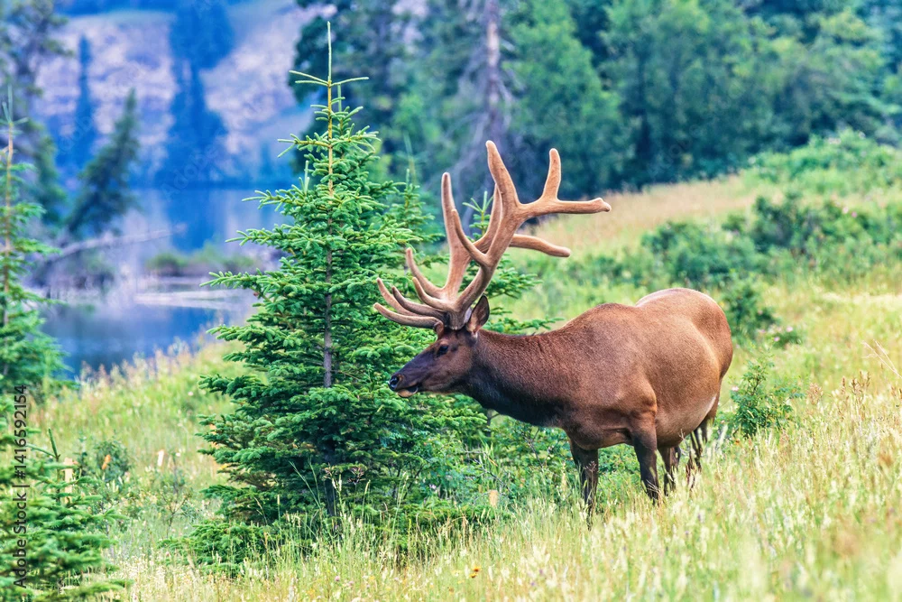 Obraz Elk with big antlers on a meadow by a lake - jelenie - Picturewall.pl