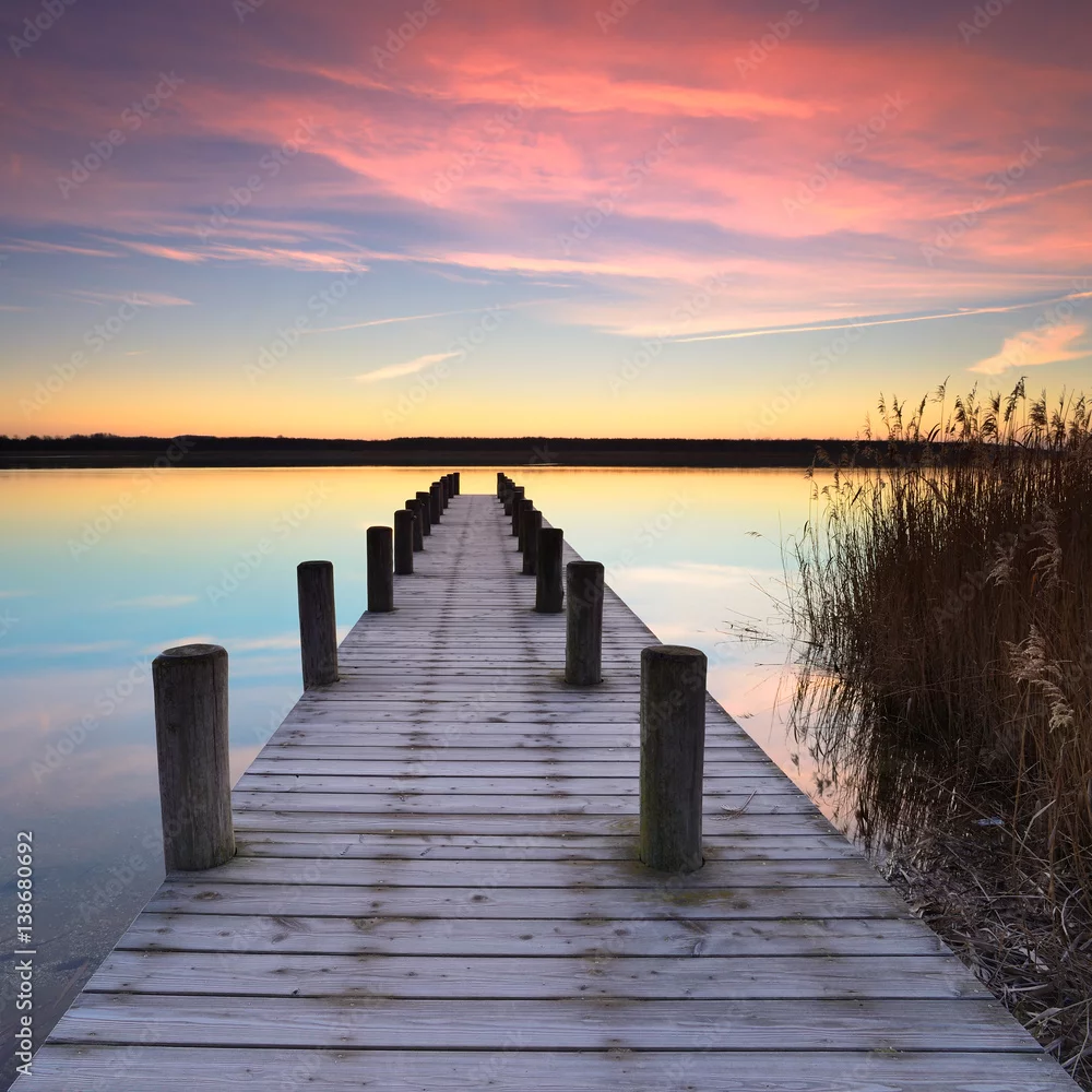 Obraz Ciche jezioro o wschodzie słońca, drewniane molo pokryte szronem