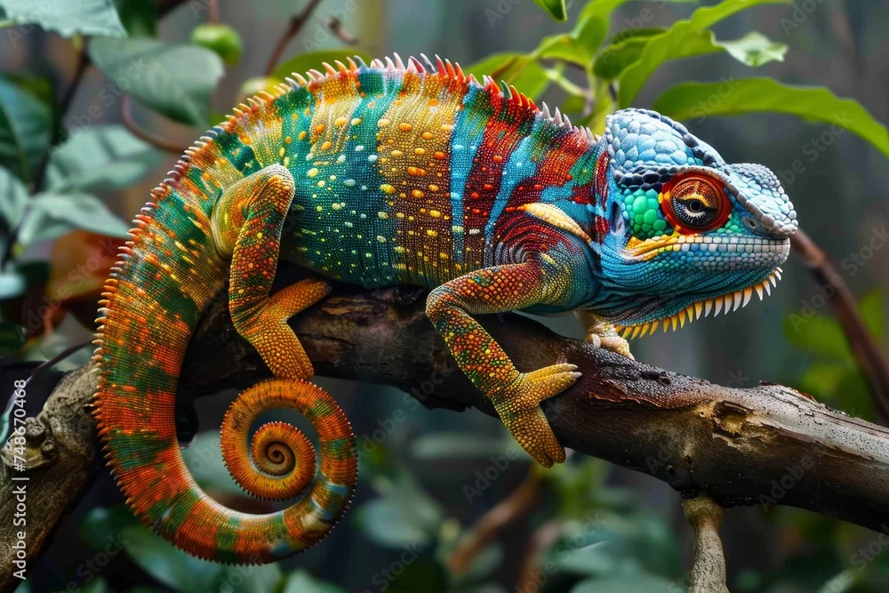 Obraz A vividly colored chameleon clings to a branch, its skin a dazzling array of colors, from radiant blues to fiery oranges.