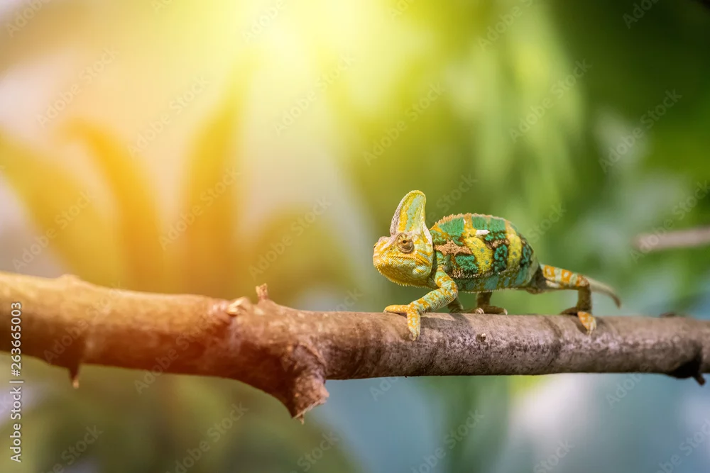 Obraz Chameleon in the zoo: Close-up picture of a chameleon climbing on a tree branch. Sunshine.
