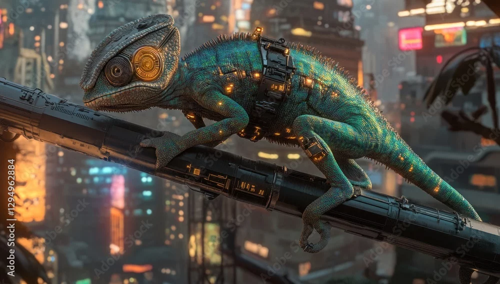Obraz Futuristic chameleon on a metal pipe in a vibrant neon city.