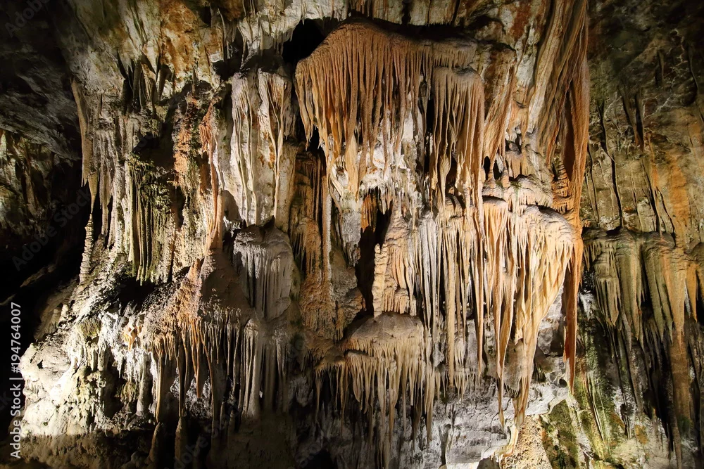 Obraz Jaskinia Postojna, Słowenia. Formacje wewnątrz jaskini ze stalaktytami i stalagmitami.