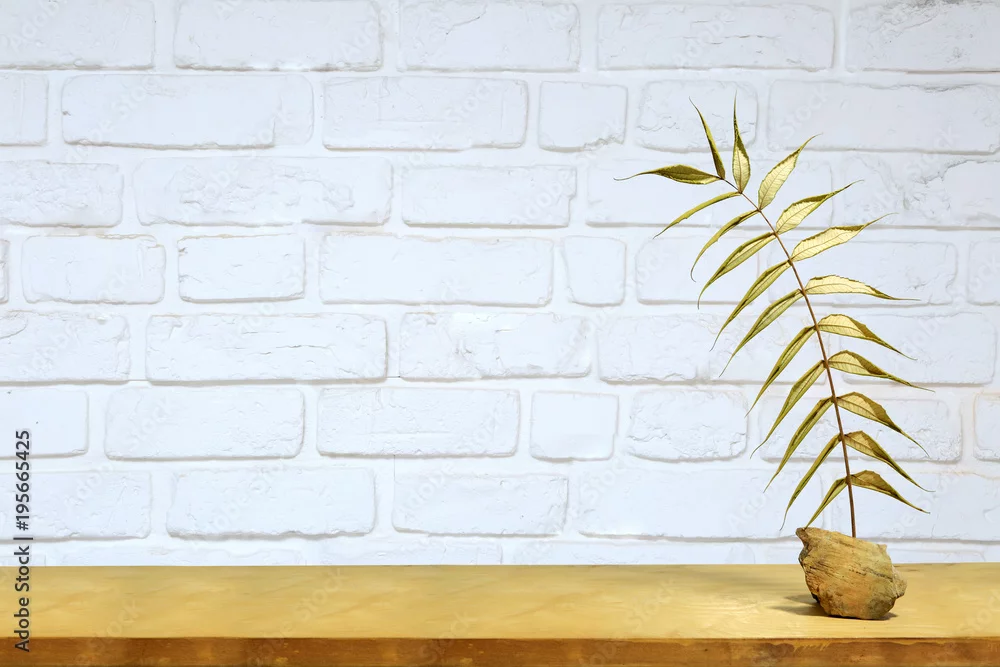 Obraz Złoty liść na półce na tle białej ścianie z cegły.