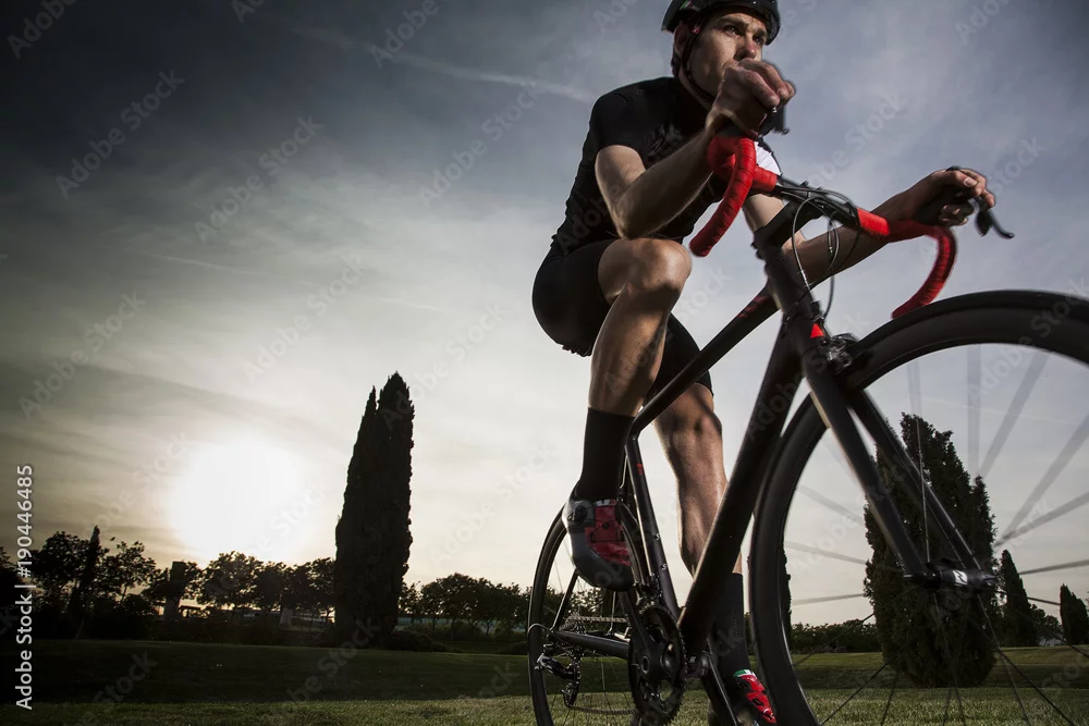 Obraz rowerzysta jedzie o zachodzie słońca na trawie