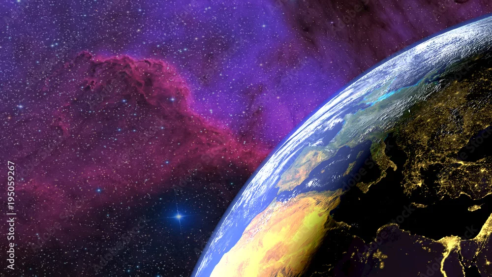 Obraz Ziemia widziana z nieba z naprzemienną nocą nocą i mgławicą w tle.