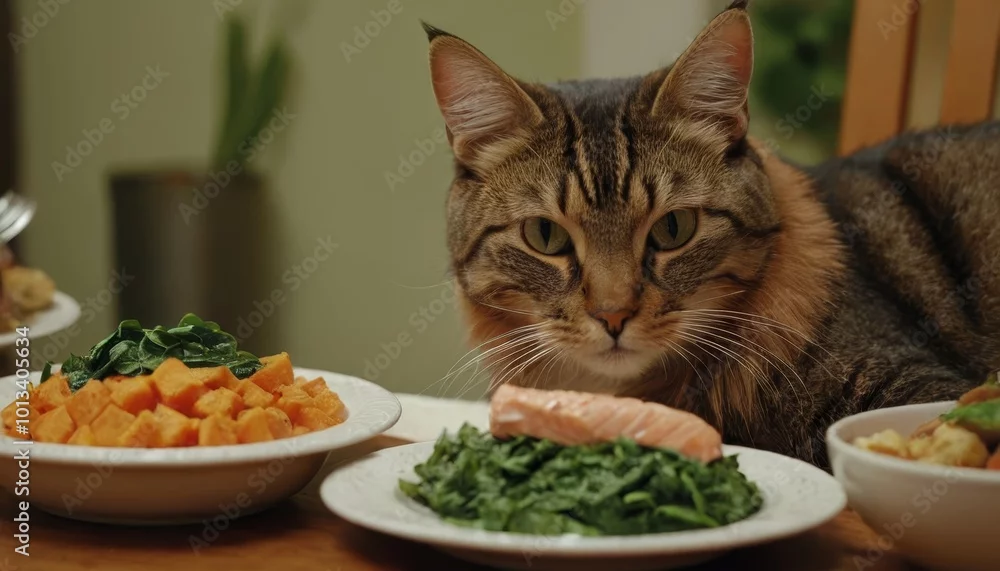 Obraz A cat savoring a gourmet meal with fresh, nutritious ingredients like salmon and vegetables, highlighting the importance of balanced feline nutrition