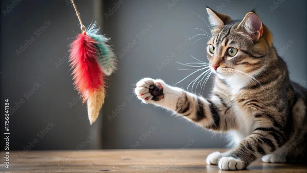 Obraz A curious cat's paw gently touches a dangling feather toy, causing it to quiver and tease the feline with its movement , cats, feather