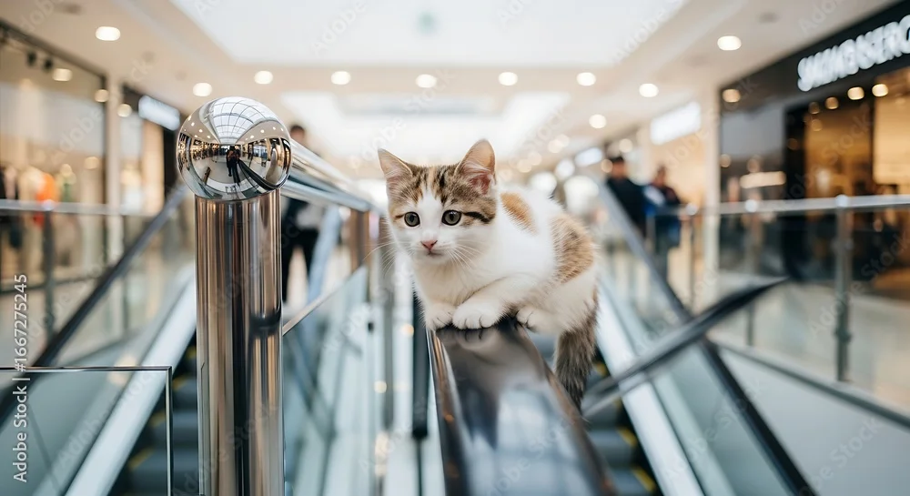 Obraz A small kitten sits on the handrail of an escalator in a shopping mall