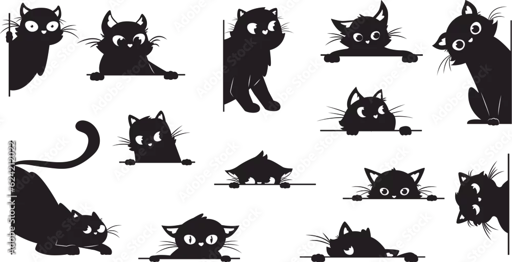Obraz Black cat looking. Peeking cats silhouettes with big eyes. Playful muzzle, creative kitty peeping from corner. Spy pets snugly vector elements