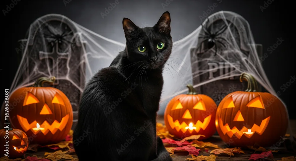 Obraz Black Cat with Green Eyes Halloween Portrait