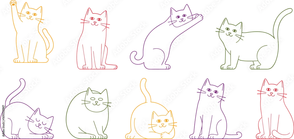 Flat vector illustration of colorful cats in playful poses, minimalistic line art style, cute feline pets, digital animal drawings for design projects