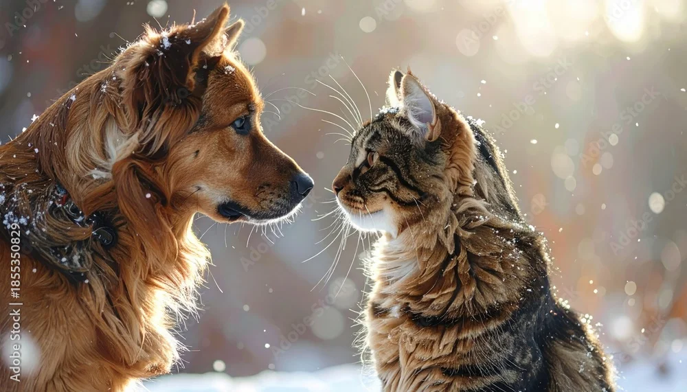 Obraz Gentle Friendship Between Dog and Cat in Snowy Winter Sunlight Outdoors with Soft Bokeh Background