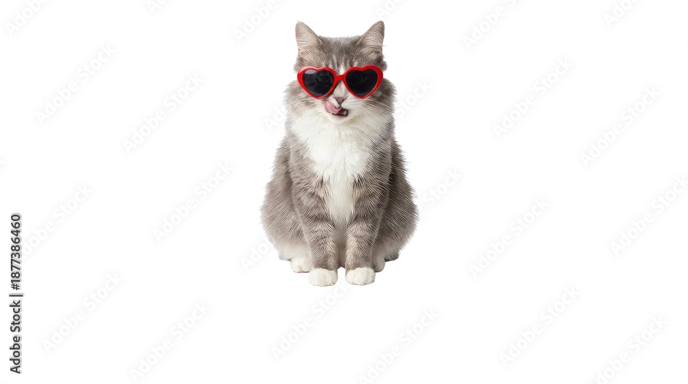 Obraz Happy valentine's day a stylish cat wearing red sunglasses sitting upright with a playful expression solid white background and no background