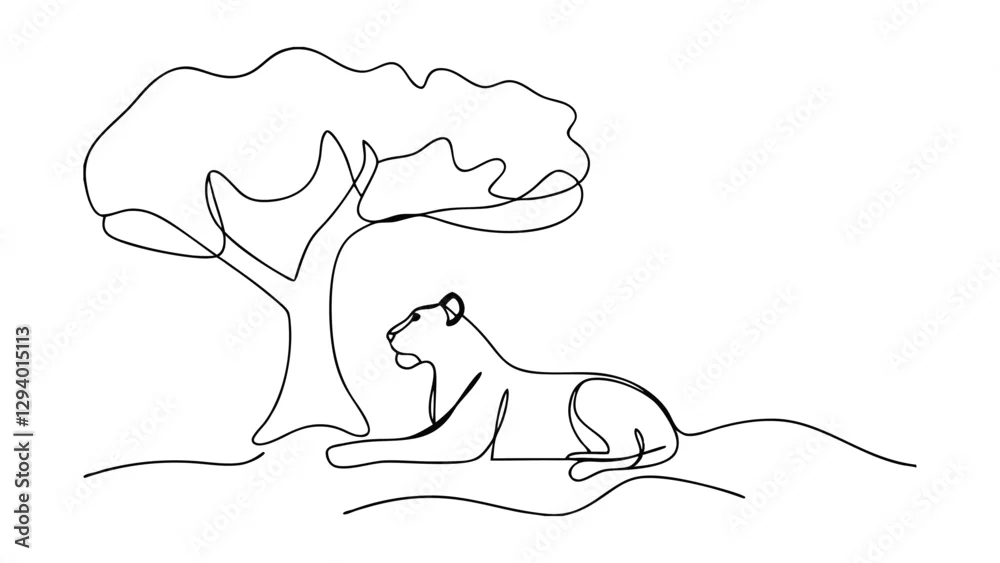 Obraz Oneline drawing of a lioness lounging beneath a tree in a minimalist style, evocative of the African savanna. Simple, elegant, wildlife art.