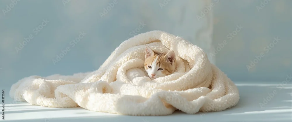 Obraz Sleeping cat in blankets background, cat, white, animal, blue, orange, adorable, feline, kitten, calico