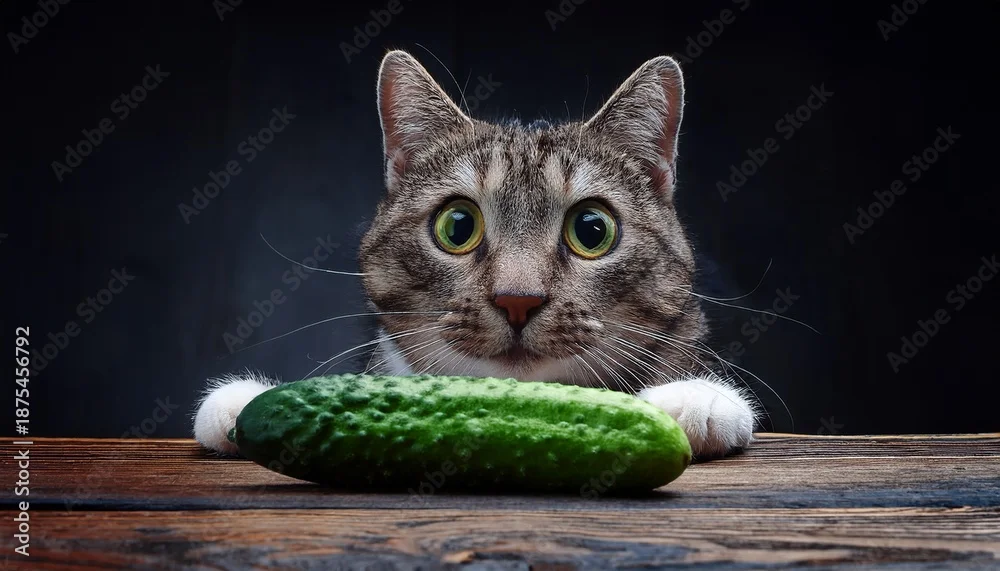 Obraz surprised gray tabby cat gazes wide eyed at a cucumber on a dark wooden surface a humorous and unexpected feline reaction captured in a still life