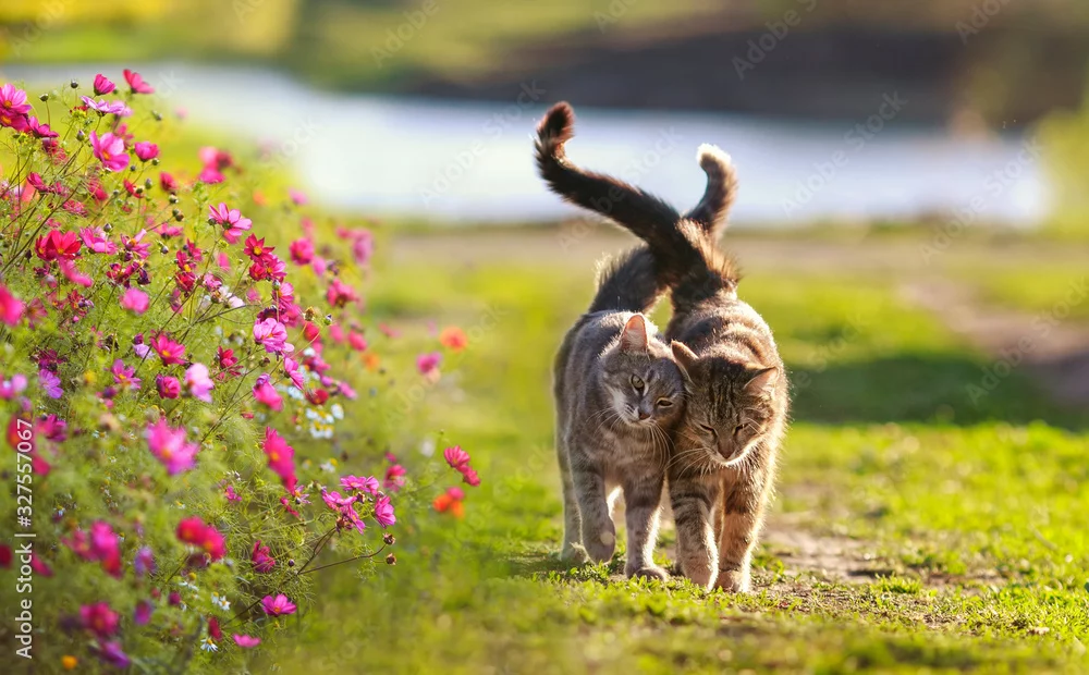 Obraz two cute striped lovebirds are walking on the green grass in the Sunny spring garden among flowers