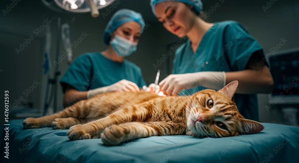 Obraz Veterinary Surgeons Performing Surgery on Orange Tabby Cat in Surgical Room with Low Angle View and Digital Artifacts