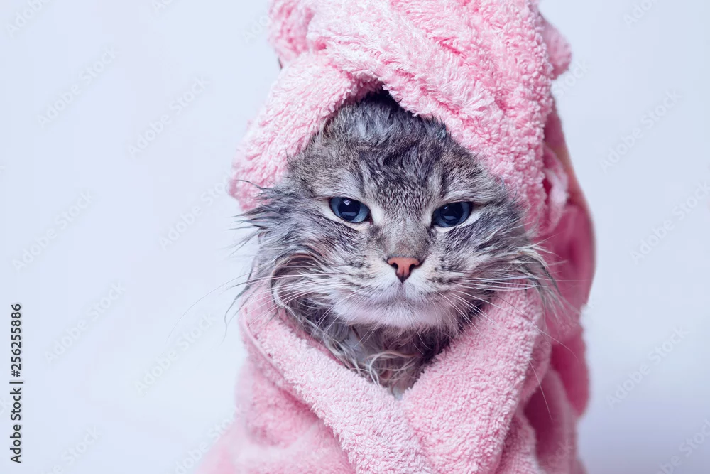 Zabawny mokry, smutny szary pręgowany kotek po kąpieli owinięty w różowy ręcznik o niebieskich oczach. Koncepcja zwierząt domowych. Właśnie umyłem ślicznego puszystego kota z ręcznikiem wokół głowy na szarym tle.
