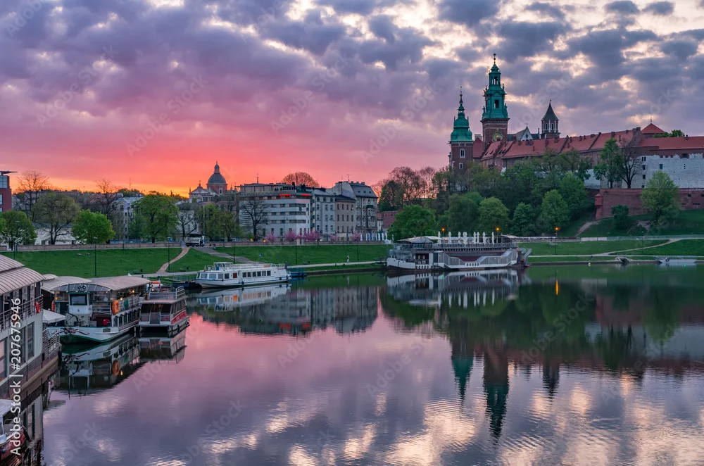 Obraz Zamek Królewski na Wawelu w Krakowie, widziany z kolorowych bulwarów wiślanych - Kraków - Picturewall.pl