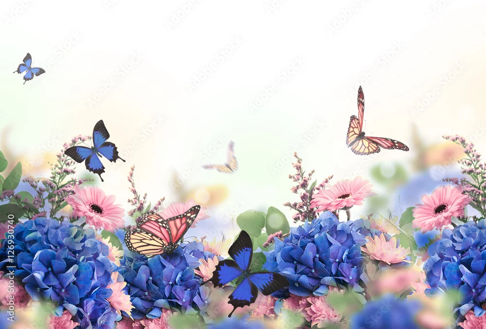 Obraz Niesamowite tło z hortensjami i stokrotkami. Żółte i niebieskie kwiaty na białym pustym miejscu. Karta kwiatowy natura. motyle bokeh.