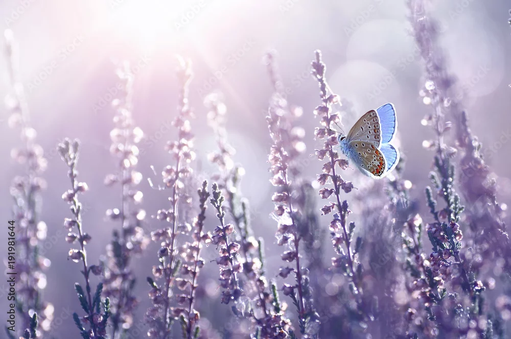 Obraz Zaskakująco piękny kolorowy kwiatowy tło. Wrzosów kwiaty i motyl w promieniach lata światło słoneczne w wiośnie outdoors na naturze makro-, miękka ostrość. Klimatyczne zdjęcie, delikatny obraz artystyczny.