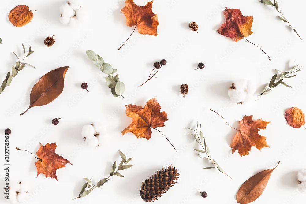 Obraz Jesienna kompozycja. Wzór wykonany z gałęzi eukaliptusa, kwiatów bawełny, suszonych liści na białym tle. Jesień, jesień koncepcja. Leżał płasko, widok z góry - liście - Picturewall.pl