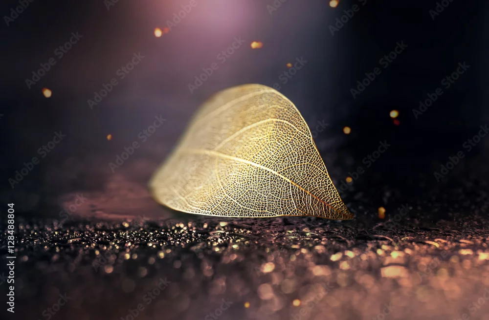 Obraz Piękny złoty przejrzysty kościec opuszcza z teksturą na błyszczącym abstrakcjonistycznym tle zamazującym z round bokeh wodą opuszcza zakończenie makro-. Jasny, wyrazisty, elegancki obraz artystyczny.