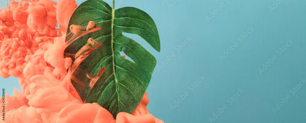 Obraz Tropikalny liść monstera z chmurą pastelowego koralowego koloru. Koncepcja lato tło. Minimalna sztuka abstrakcyjna.