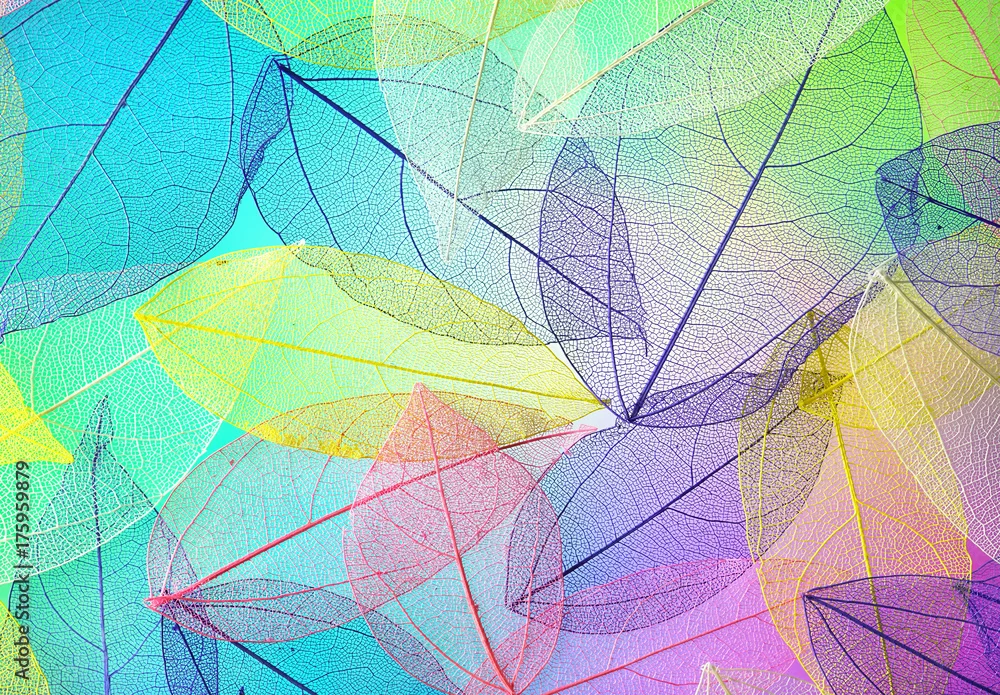 Obraz Wiele przezroczystych sylwetek szkieletu pozostawia na wielokolorowym niebieskim fioletowym bzu i różowym tle. Kwiatowy wzór pięknych liści w przyrodzie makro.