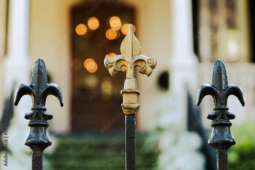 Obraz A cast wrought iron fence lined with black and gold fleur de lis post toppers with a New Orleans southern style home in the background - lisy - Picturewall.pl