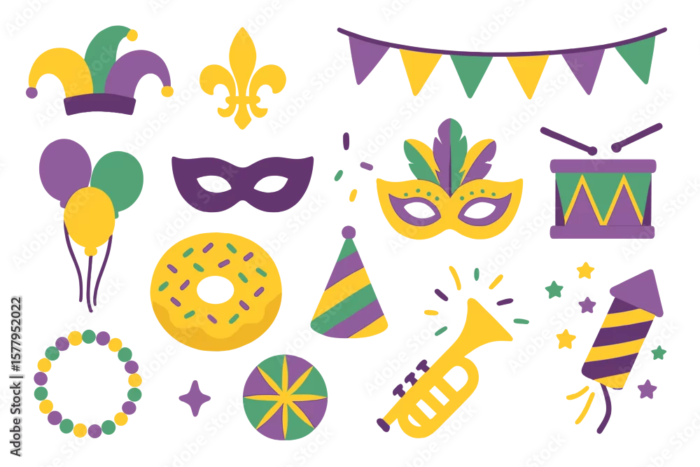 Obraz A set of flat icons for Mardi Gras carnival, including individual festive elements for festivals and masquerades, featuring masks, patterns, symbols, and the fleur de lis sign, representing Shrove