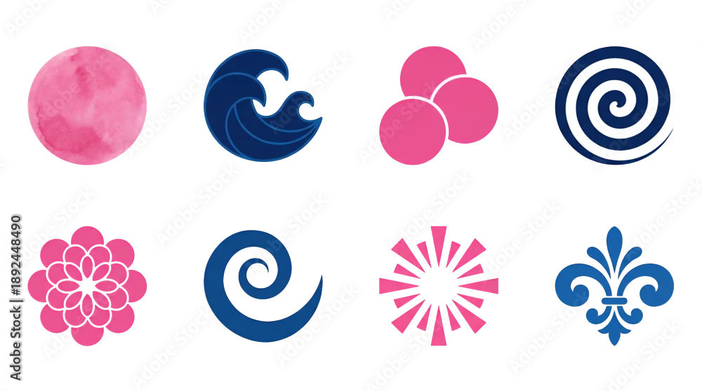 Obraz Abstract circular and floral graphic set including waves, spirals, watercolor texture, and fleur de lis isolated. Decorative branding and pattern design collection.